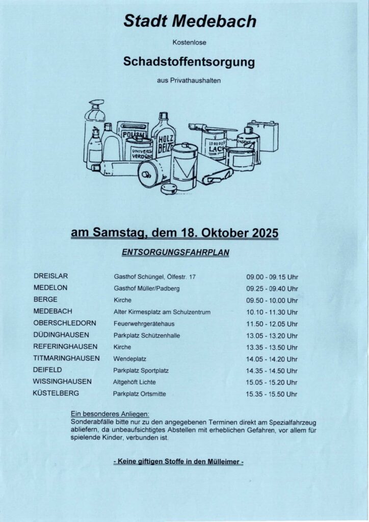 Samstag 18 Oktober könnt ihr wieder Schadstoffen entsorgen an die Kirche zwischen 13.35 und 13.50